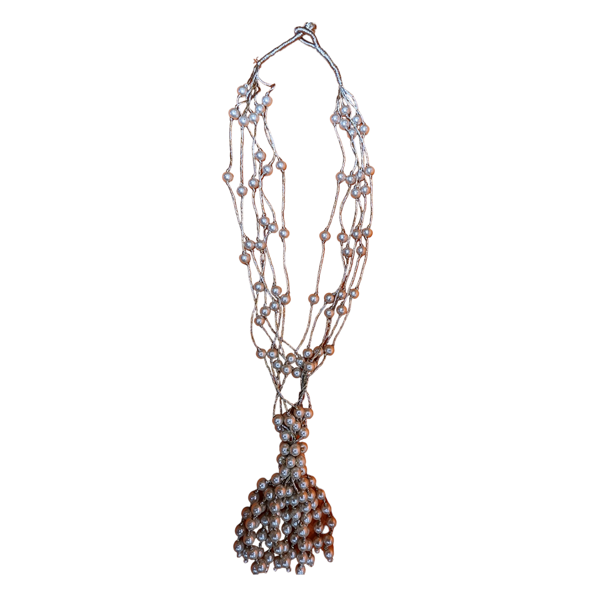This Cluster Pearl Long Chain Party Wear Silver Polish adds a touch of elegance to any outfit. The sleek design features a combination of pearls and silver polish for a sophisticated and stylish look. Perfect for any occasion, this necklace is sure to turn heads.