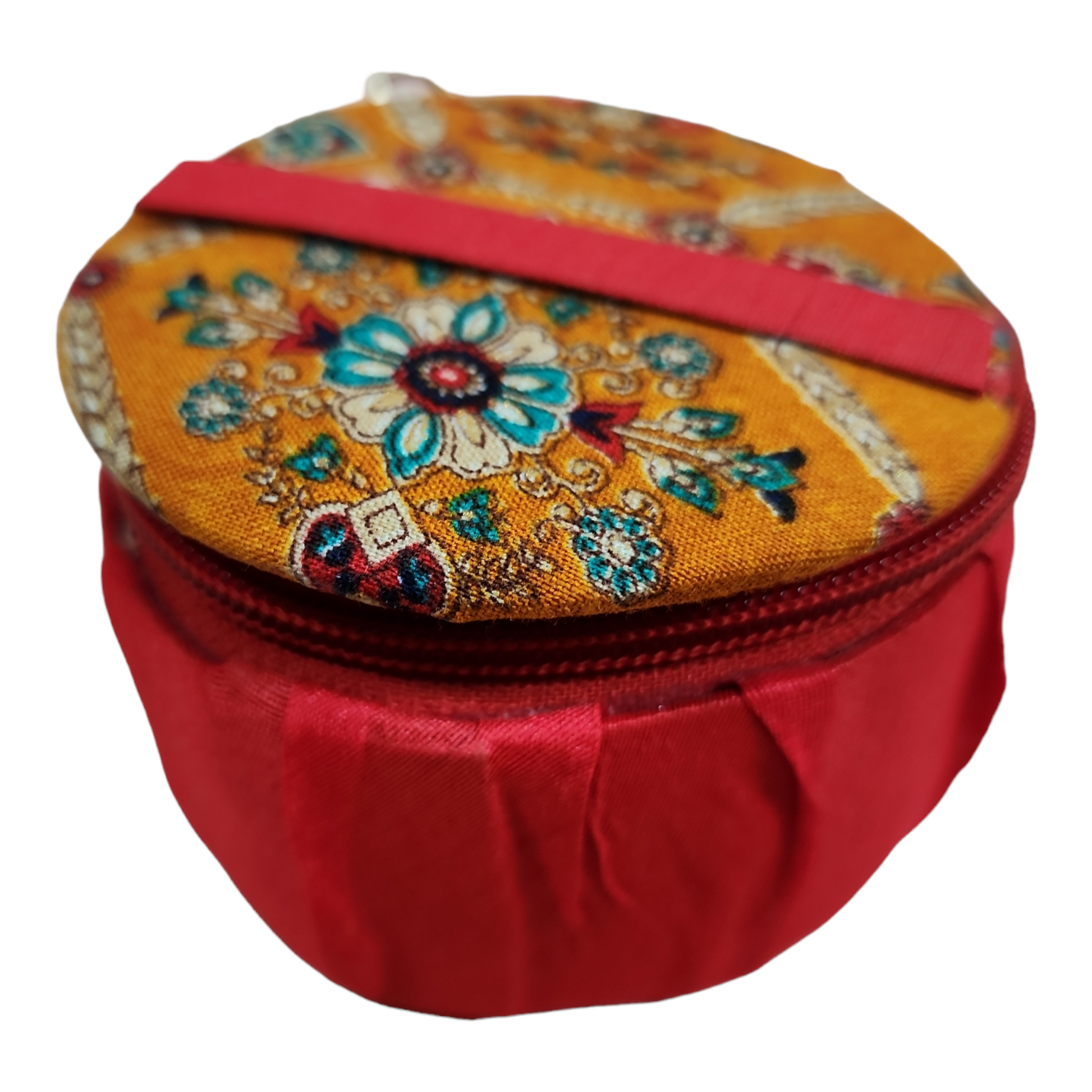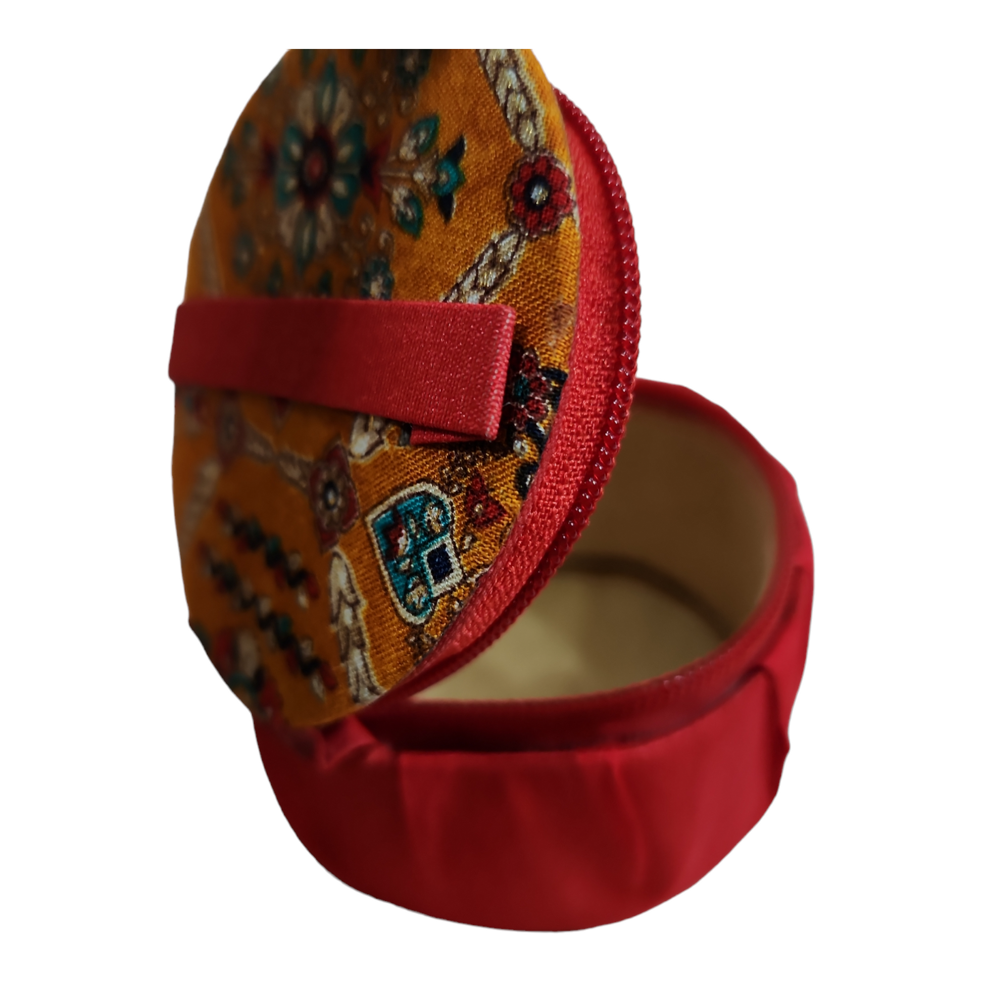This Kalamkari Design Bangle Box is a perfect storage solution for your jewellery collection. The lid is made of printed cotton and the sides feature a luxurious silk fabric while the inner wall is lined with velvet, making it a stylish and protective choice. The snug design keeps your bangles secure and safe from damage.