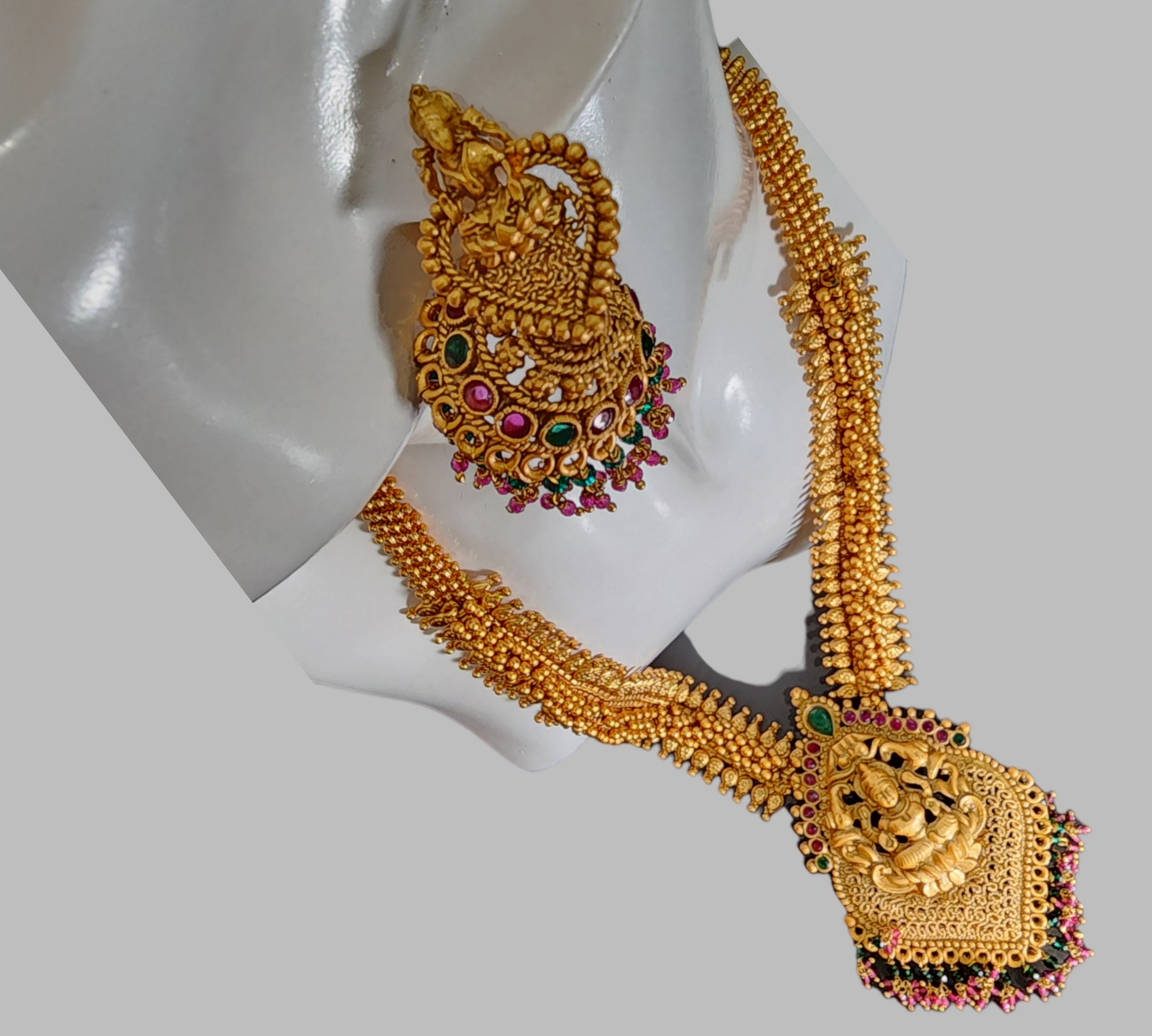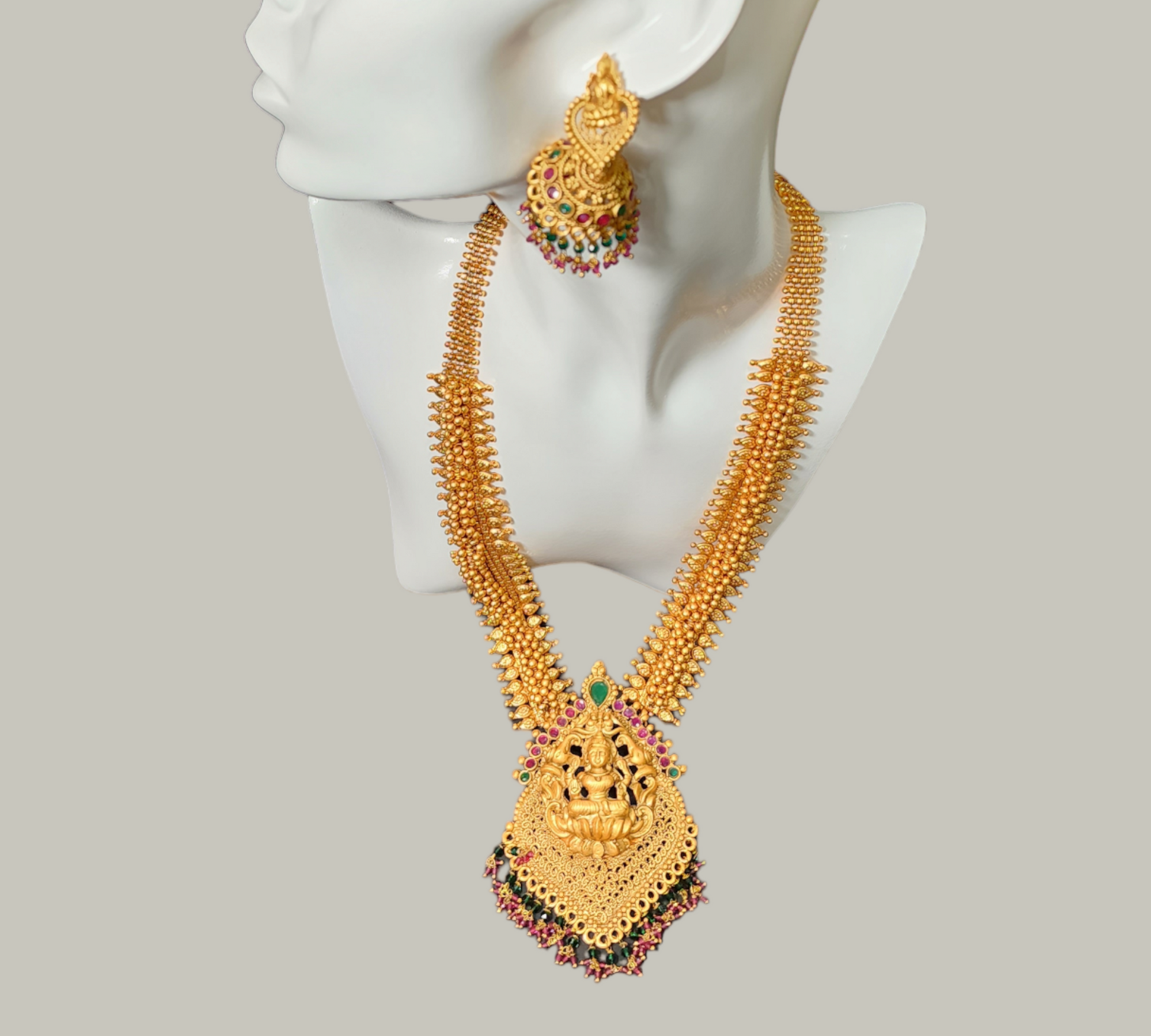 Necklaces Set Designer Style Matte Gold Finish Lakshmi Pendant Earrings Long wear