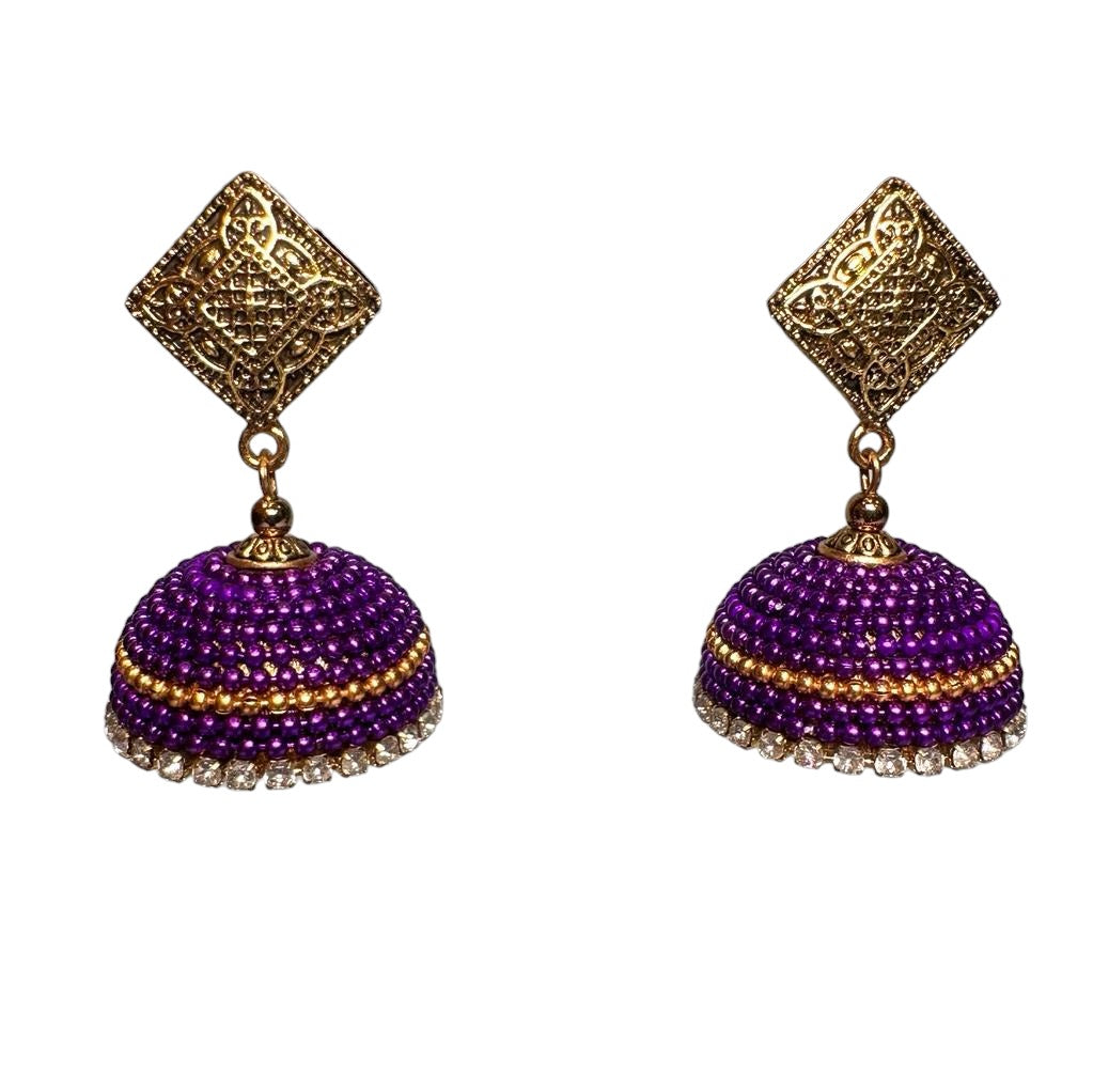 This eye-catching jhumka features purple beads delicately accented with a white stone. Its lightweight design ensures maximum style with minimum effort, making it a perfect choice for any outfit.