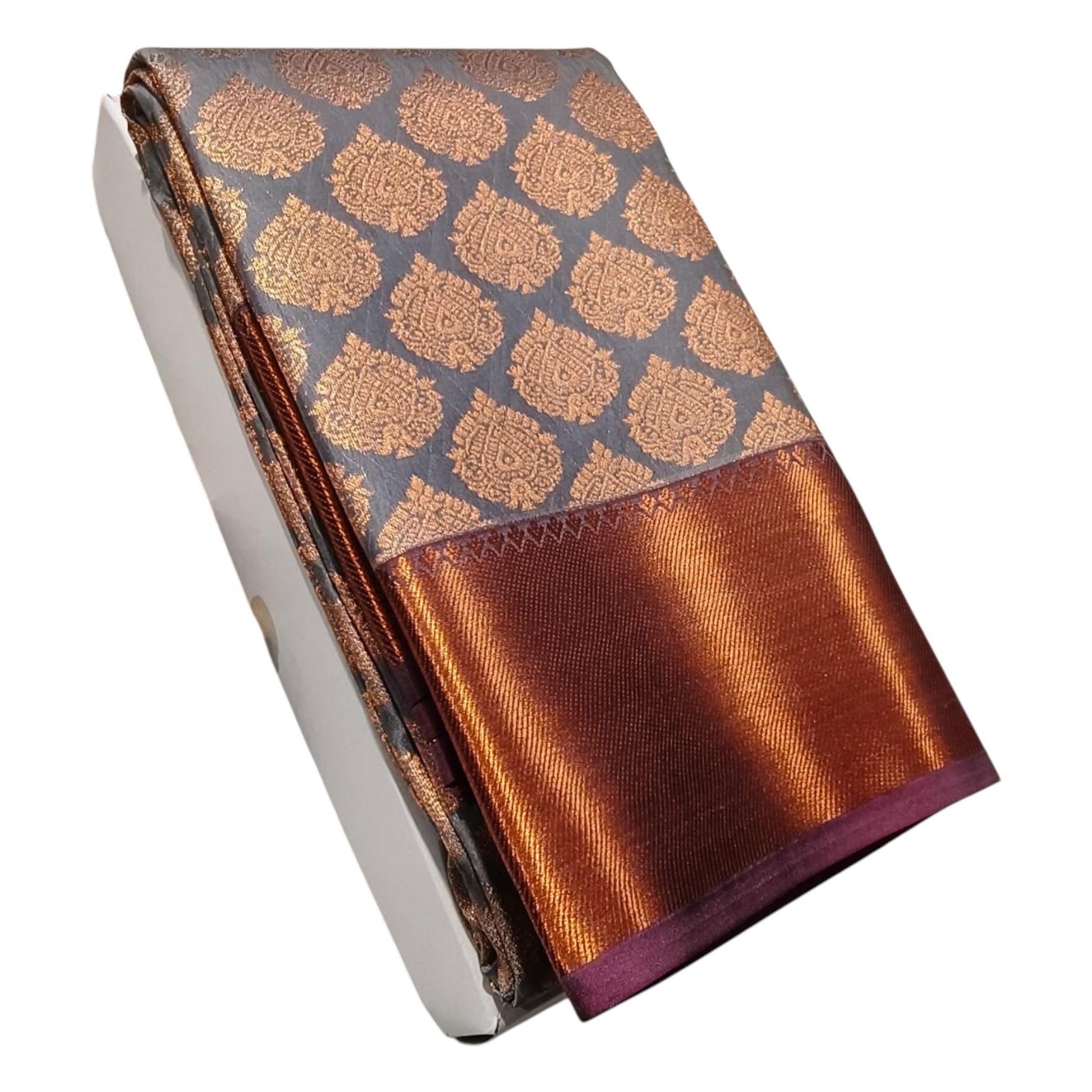 Indulge in the epitome of modern elegance with our stunning Grey & Pink Karizma Silk Saree. This exquisite piece, crafted from premium quality silk, effortlessly blends the sophistication of grey with the vibrancy of pink, creating a captivating contrast. The intricate printed zari work adds a touch of luxury, while the stitched sides offer convenience and ease of wear. Whether you're attending a wedding, a party, or a festive occasion, this saree is the perfect choice to make a lasting impression. Embrace the fusion of tradition and contemporary style with this versatile and stylish ensemble.