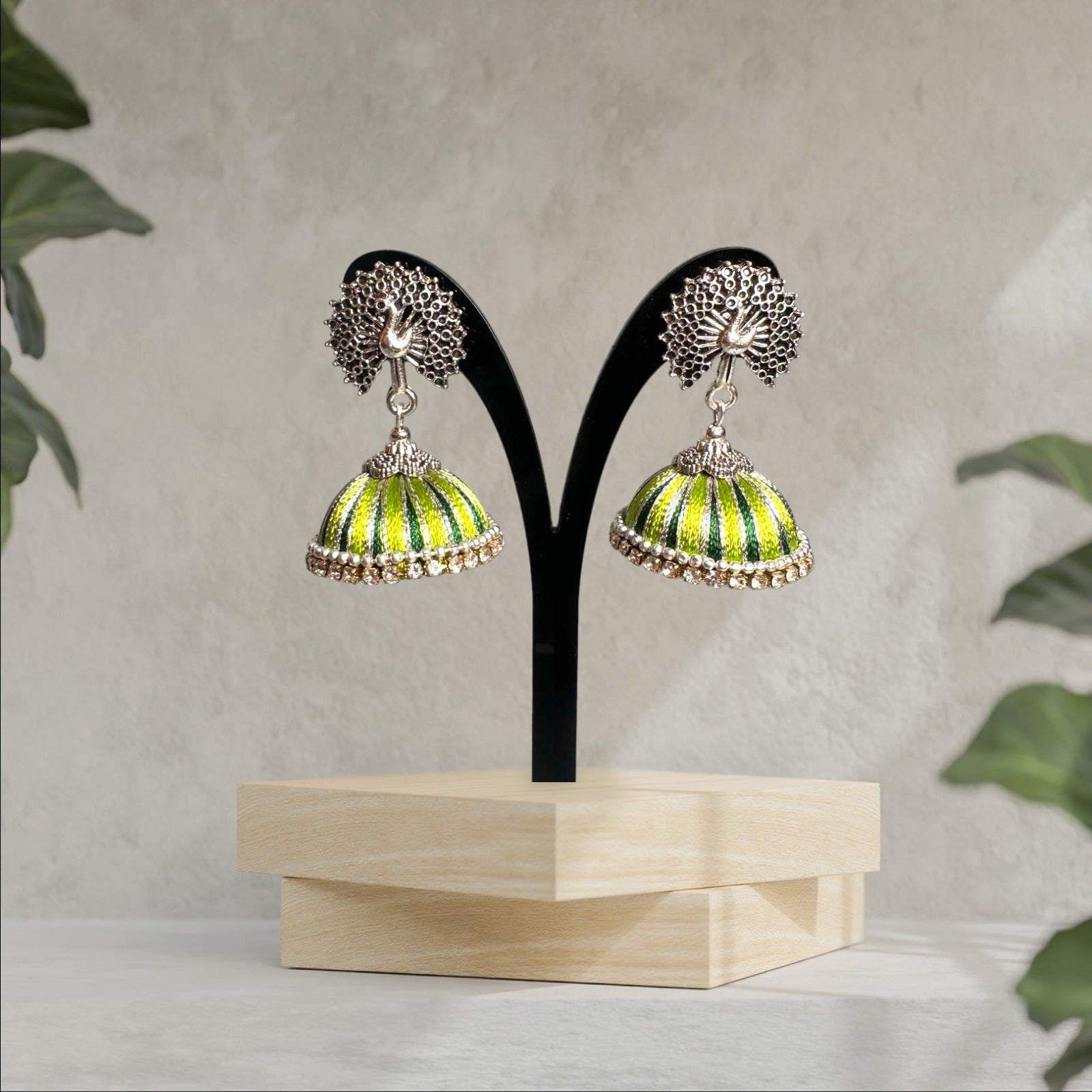 Silk Thread Light Green Peacock with White Stones Jhumka