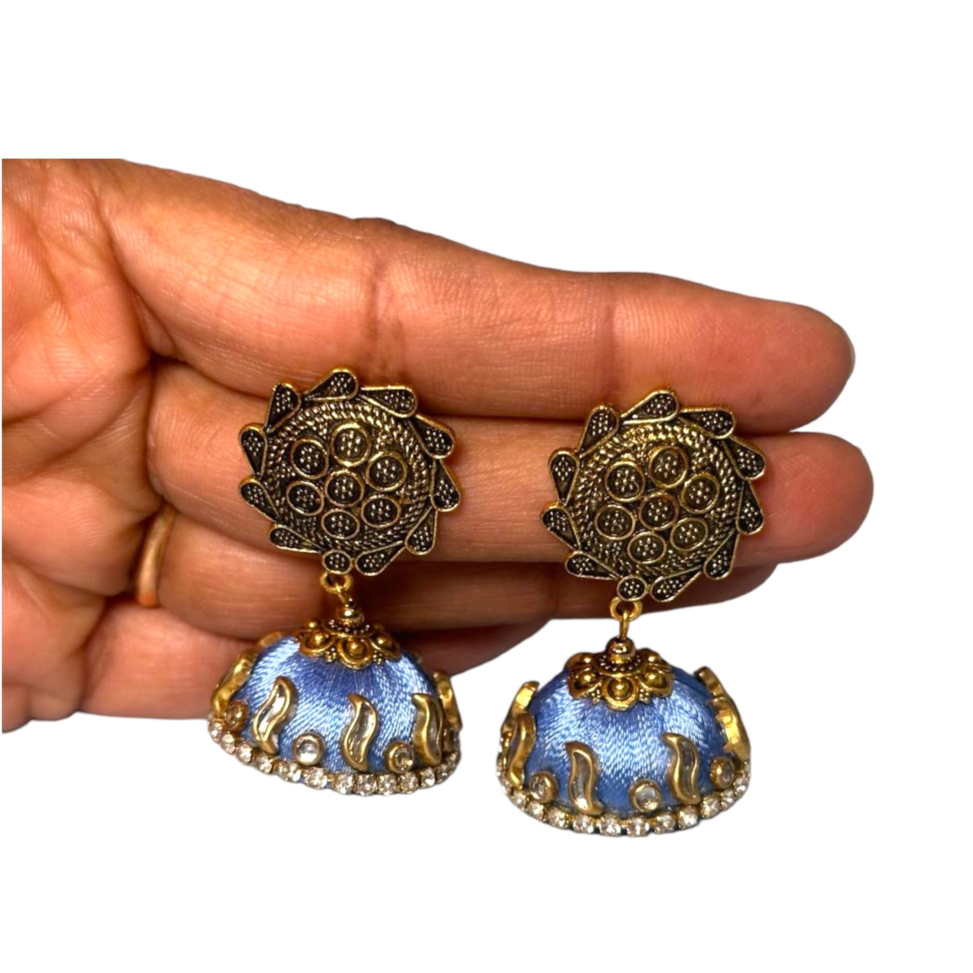 Silk Thread Malibu Blue with Stone Work Big Jhumka / Light Blue Jhumka