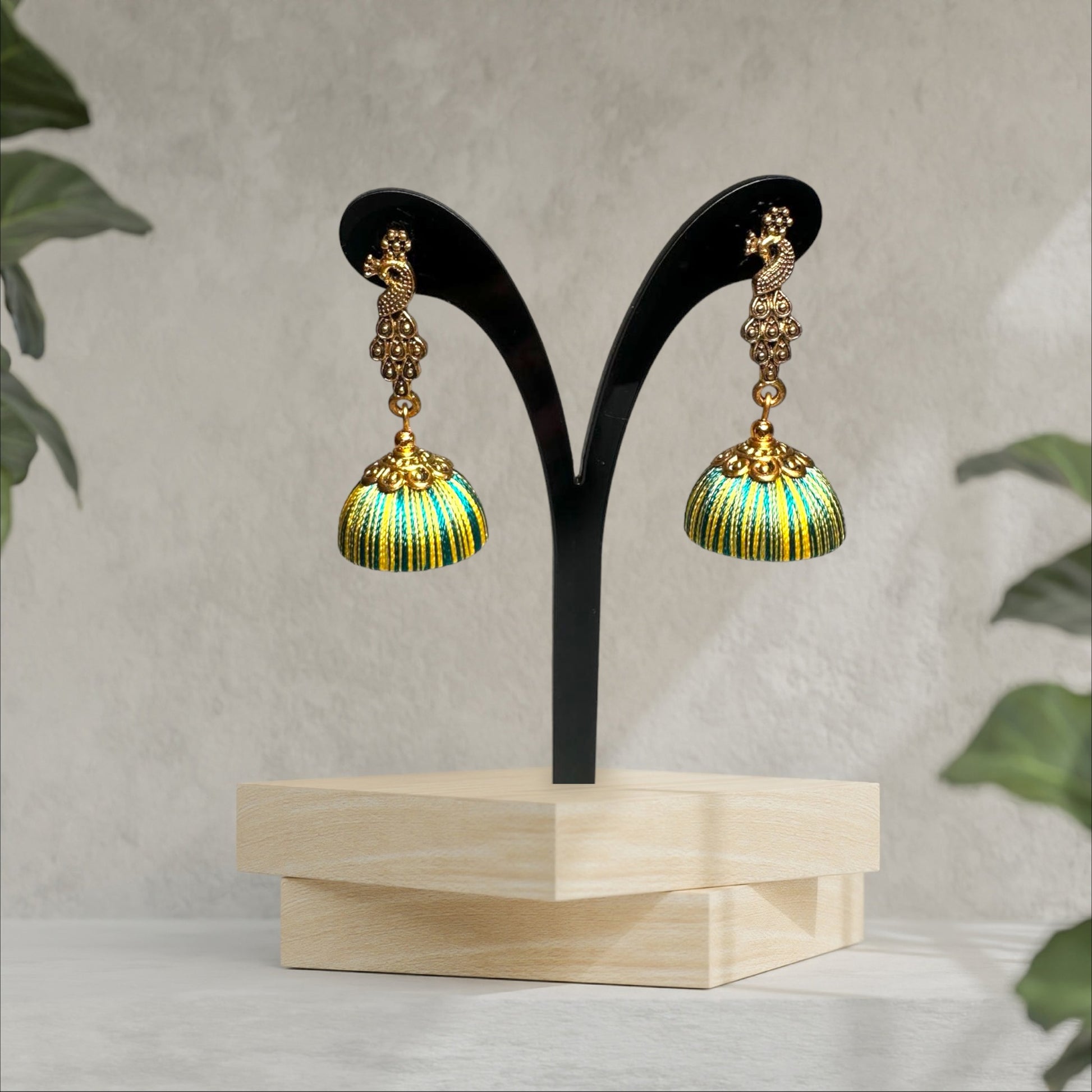 This Simple Silk Thread Peacock Green Jhumka is a unique and beautiful piece of jewelry crafted from fine silk thread. The intricate weave of the threads creates an elegant look that is perfect for any occasion. The jhumka has a delicate yet eye-catching design and is sure to make a stunning statement.