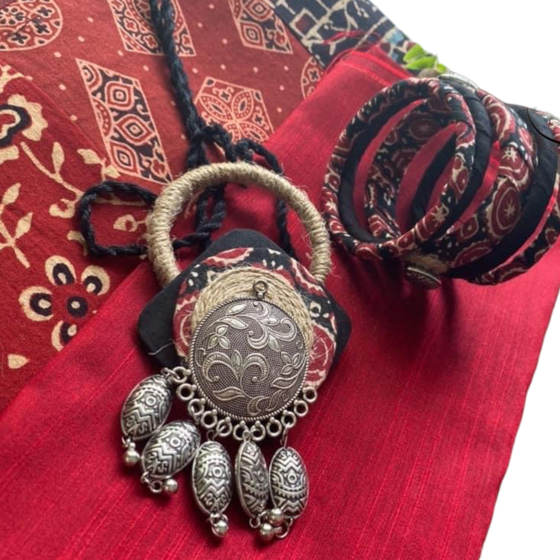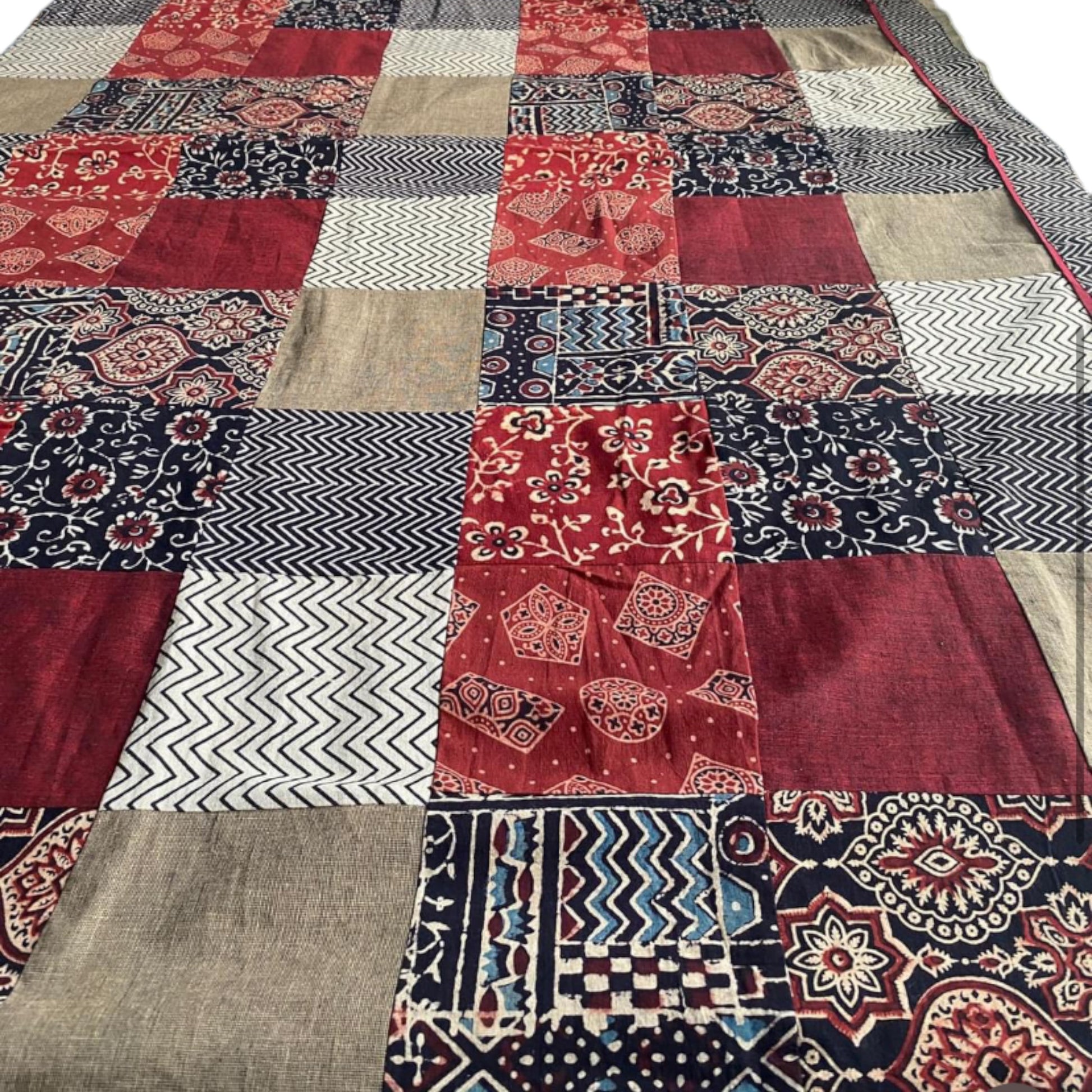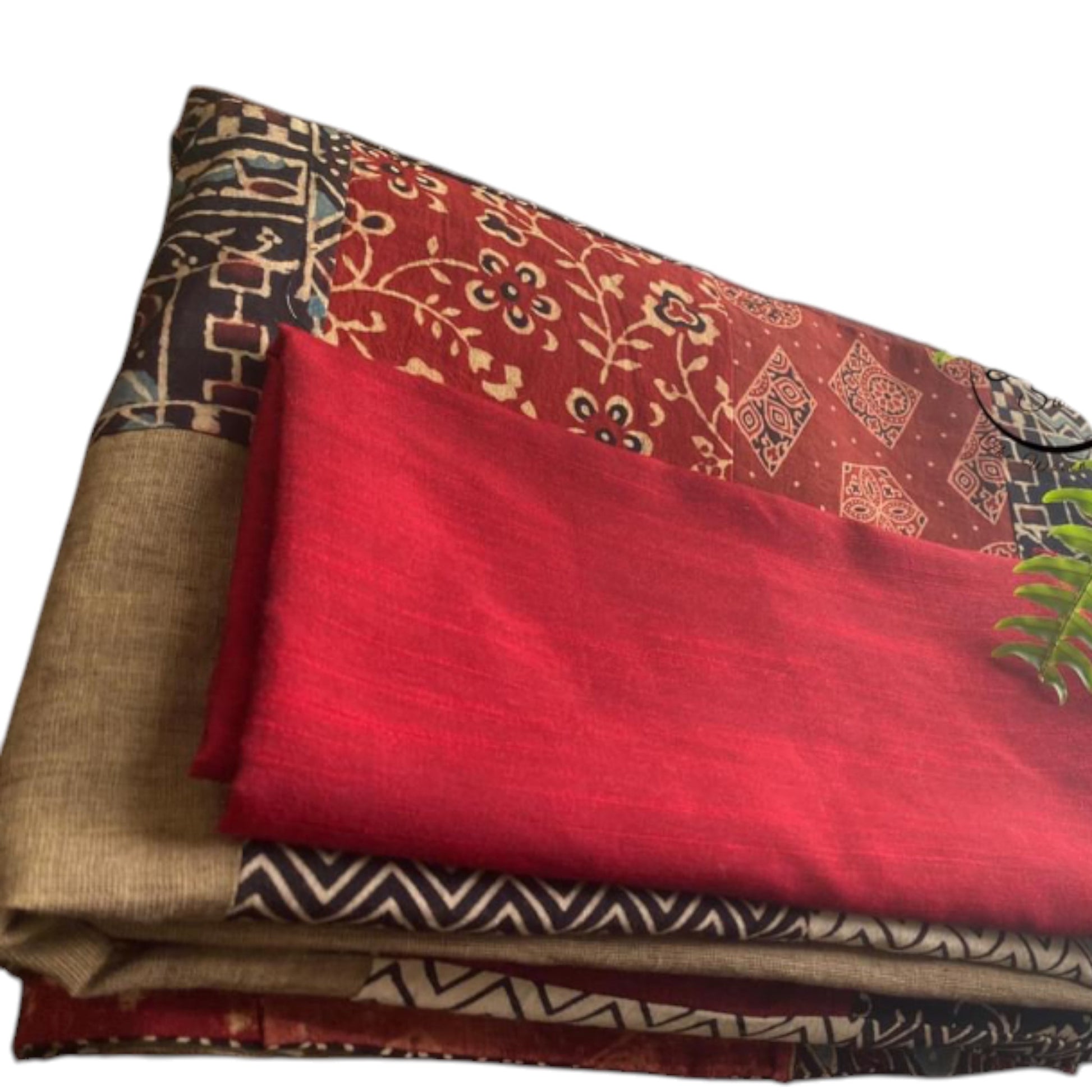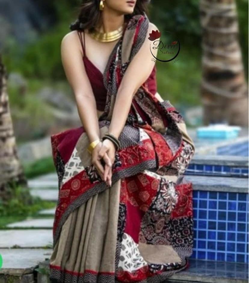 Embrace the simplicity and elegance of our Khadi Cotton Saree, adorned with beautiful Ajrakh patchwork. This piece showcases the rich heritage of Indian textiles. The saree comes with a maroon blouse piece, fall, and edging, ready to be worn or gifted